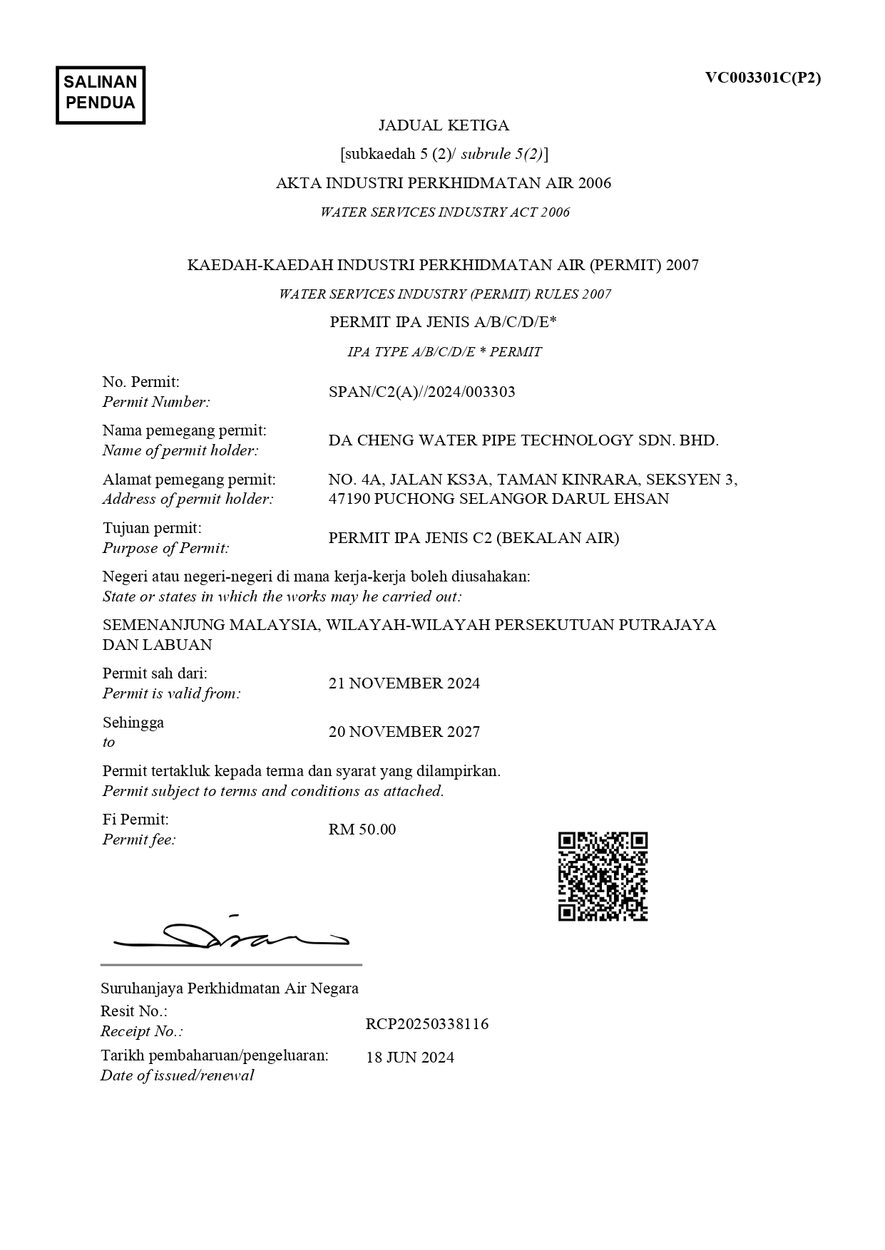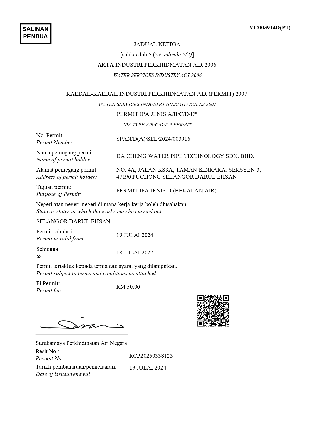 Da Cheng Water Pipe Technology Sdn. Bhd. is dedicated to maintaining the highest standards in every project. Our commitment to quality, safety, and customer satisfaction is reinforced by our industry-recognized certifications. These certifications are a testament to our adherence to ISO standards and our pursuit of excellence in water infrastructure construction.